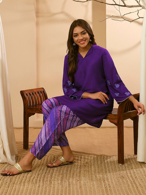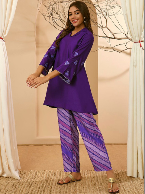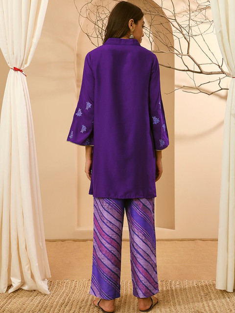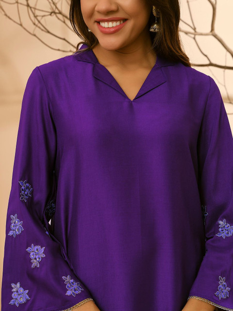 Purple printed embroidered top has round neck & three-quarter sleeves with slip-on closure