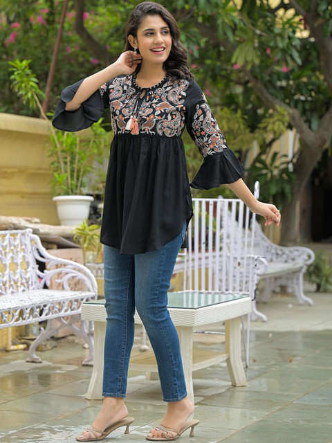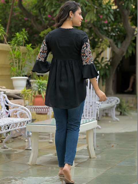 - Tie-up neck, three-quarter, bell sleeve sleeves