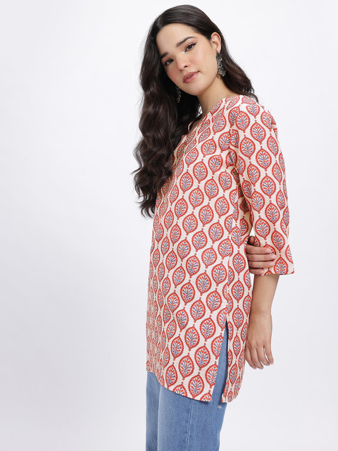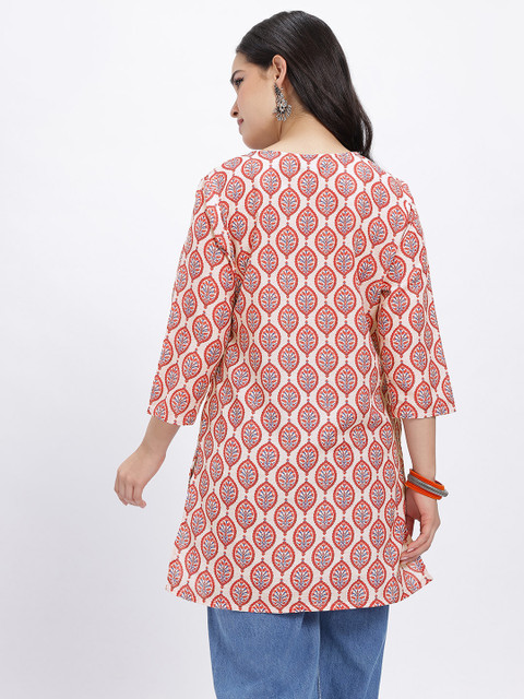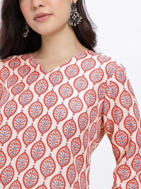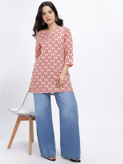 This kurti is a stylish classic, featuring a flattering V-neckline and a relaxed silhouette with vibrant ethnic prints for an effortlessly chic look.