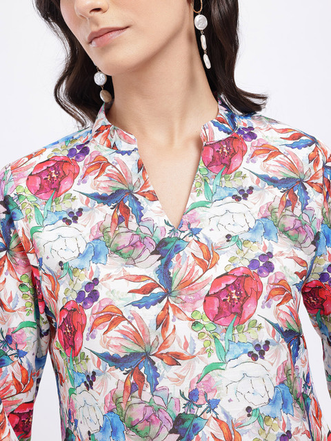 A chic, floral print mandarin-collar straight kurti blending modern artistry with refined tailoring, lightweight fabric, breathable comfort, versatile day-to-night wear for effortless elegance.