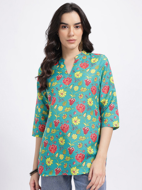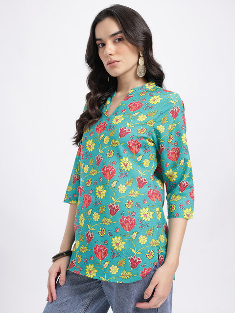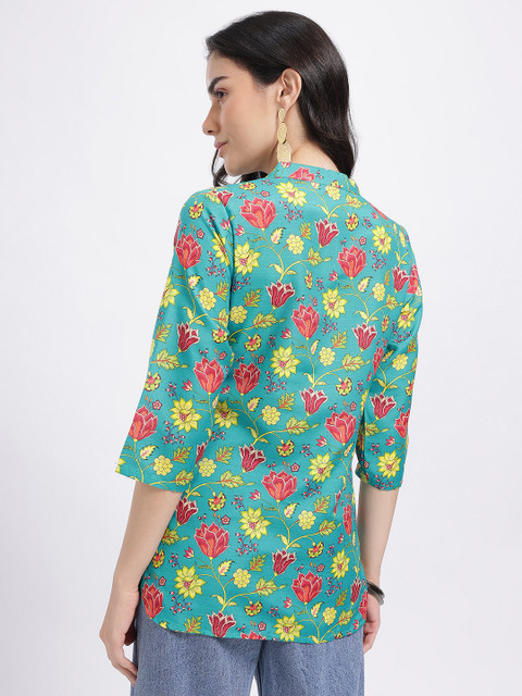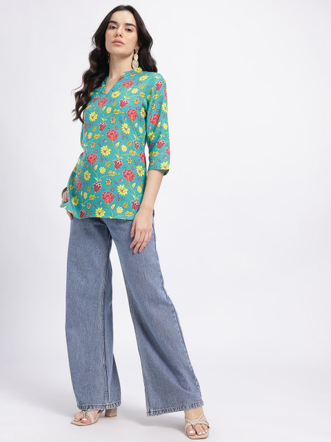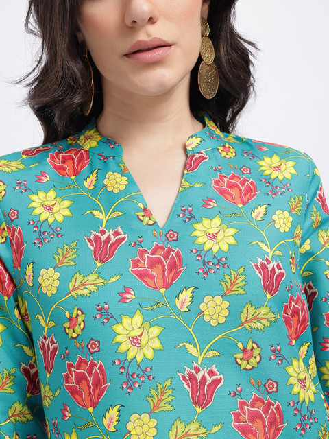 Stay cool and chic in our Printed Mandarin Collar Straight Kurti; crisp mandarin collar, breathable material, and a straight-fit cut create a polished look for office meetings and casual outings.