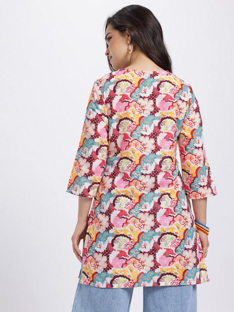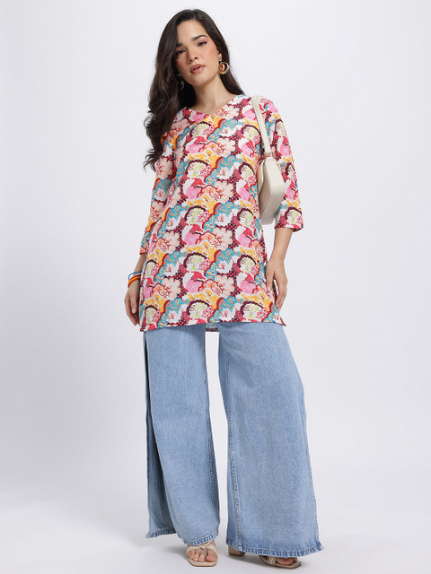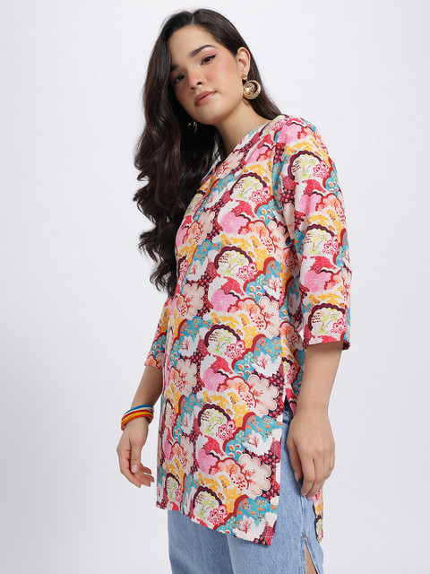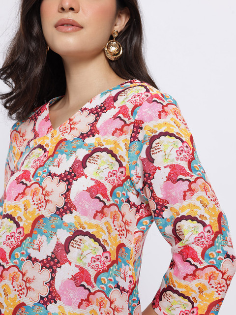 Contemporary print meets elegance–this straight kurti blends earthy charm with intricate detailing, making it a perfect pick for effortless style with a touch of tradition.