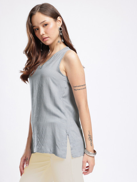 The timeless striped pattern is given a modern, earthy feel by its rustic texture, adding a subtle charm to your wardrobe. A graceful V-neck cut completes the design, making this kurti an effortlessly chic and versatile piece for any casual outing.
