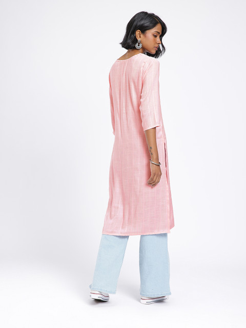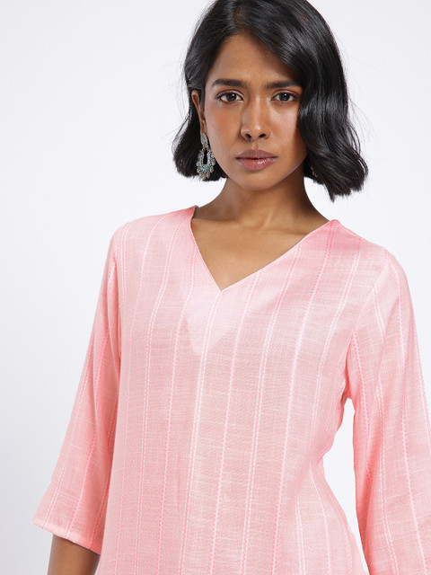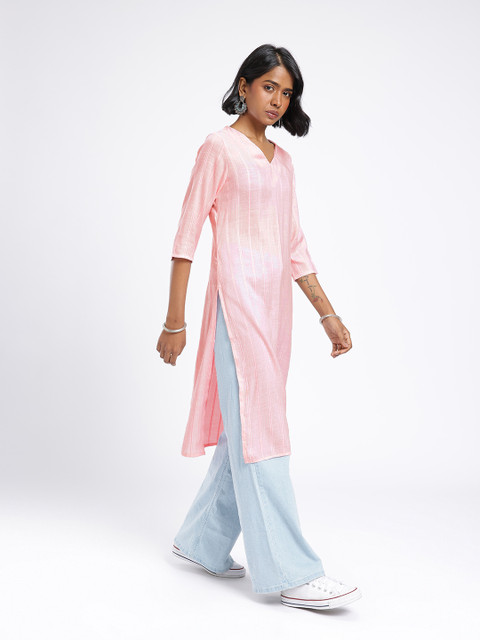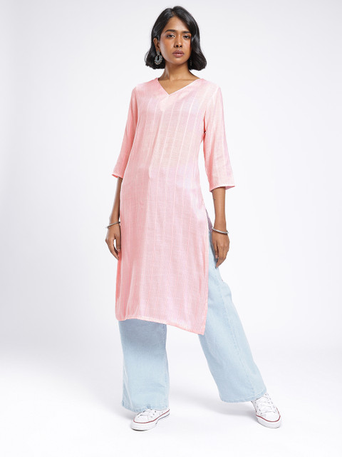 Crafted with a subtle woven texture and all-over stripes, this straight kurta comes with a flattering V-neckline. Its minimal design is both elegant and versatile. Ideal for workdays, casual outings, or effortless layering.