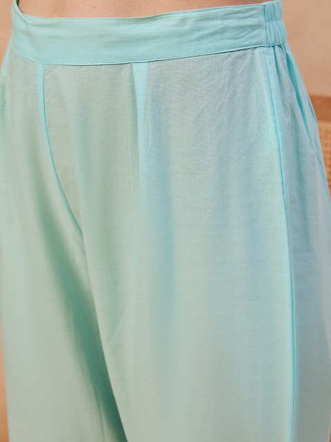 Turquoise blue mid-rise trouser, has slip-on closure and straight hem