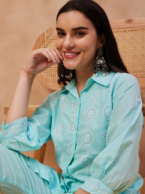 Turquoise blue self-design top, has shirt -collar, three-quarter sleeves, full placket button closure and regular waist hem