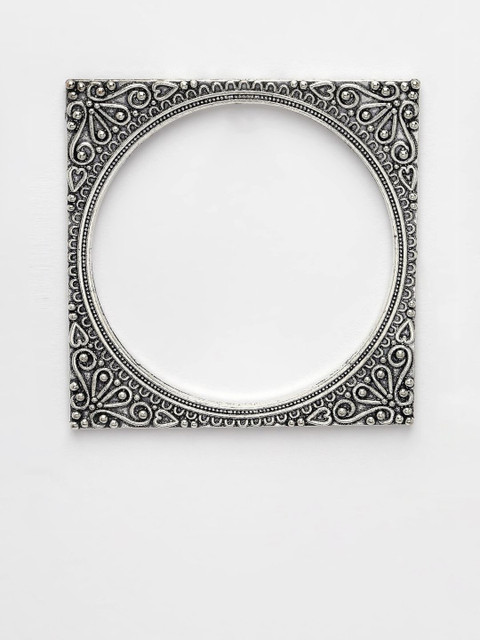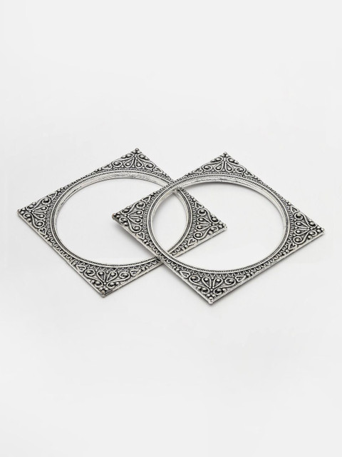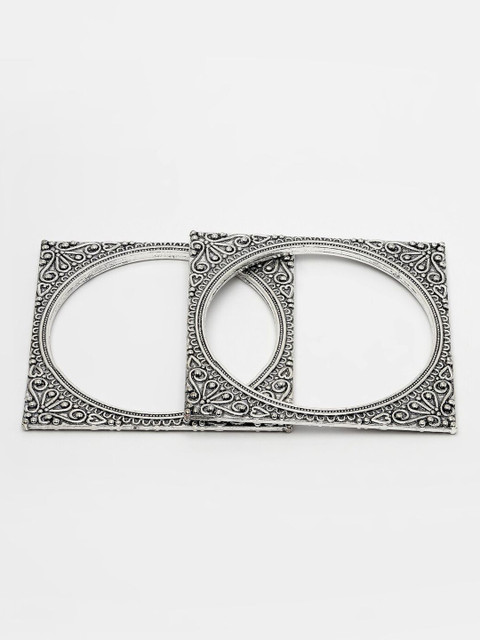 Set Of 2 Silver-toned oxidized square shaped bangles, each has intricate textured detail, secured with slip-on closure