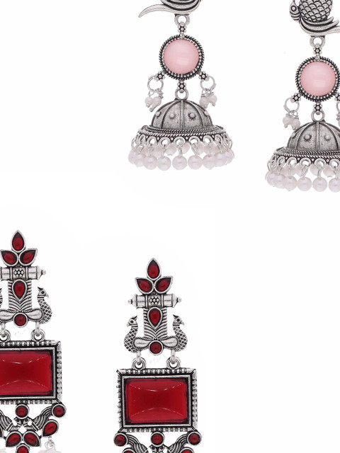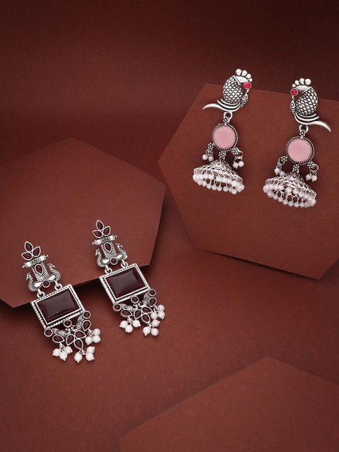 Silver-toned and maroon, white contemporary drop earrings, silver-plated, has has artificial stones studded and beaded details
