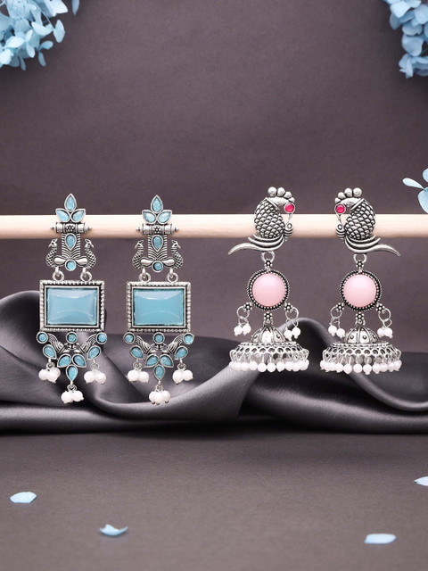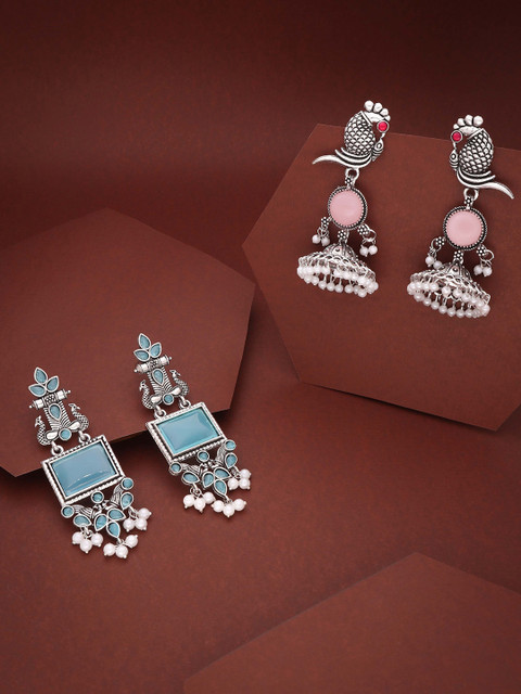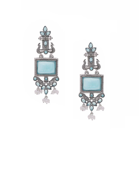 Silver-toned and blue, white geometric shaped drop earrings, silver-plated, has has artificial stones studded and beaded details