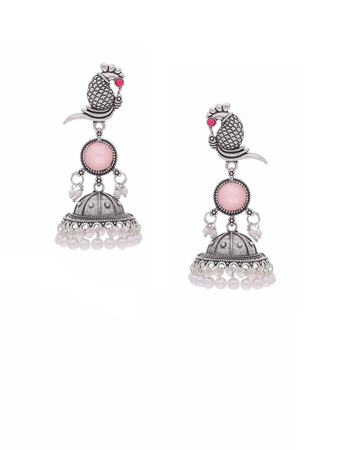 Silver-toned and pink, white dome shaped jhumkas, silver-plated, has artificial stones studded and beaded details