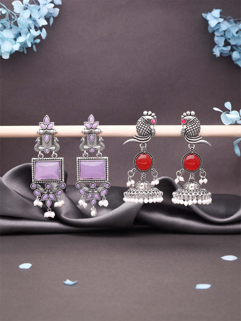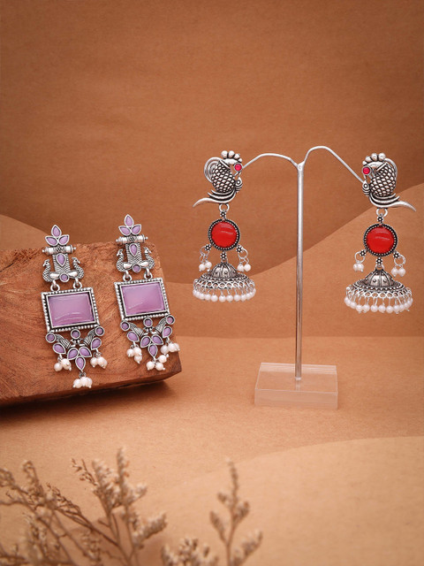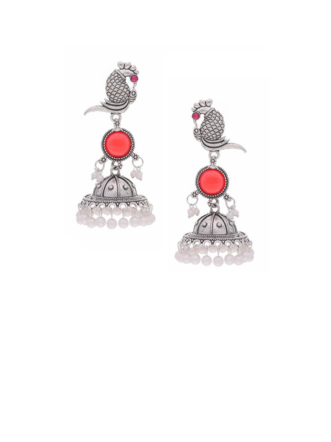 Silver-toned and red dome shaped oxidised jhumkas,has artificial stones studded details secured with a post and back Closure