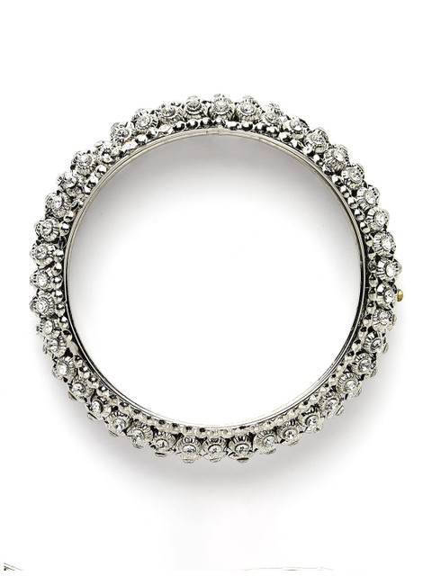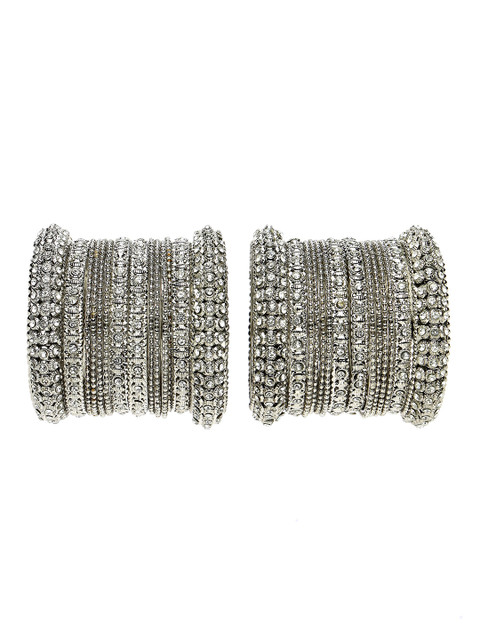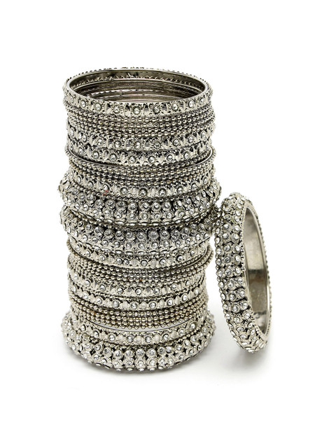 Set of 28 Silver-Plated Stone-Studded Textured Oxidized Bangles, secured with slip on closure