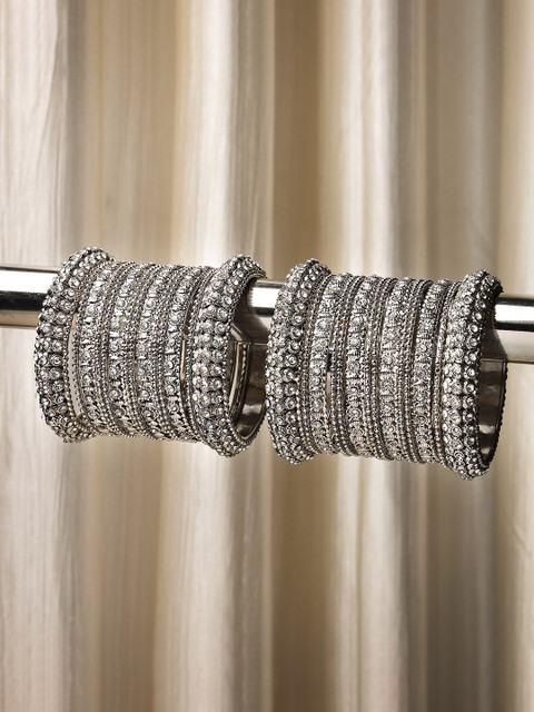 Anouk Set Of 28 Silver-Plated Stone-Studded Textured Oxidized Bangles