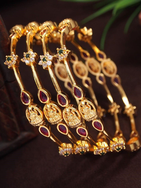 Gold-plated bangles, each has green & pink american diamond-studded details, secured with slip-on closure
