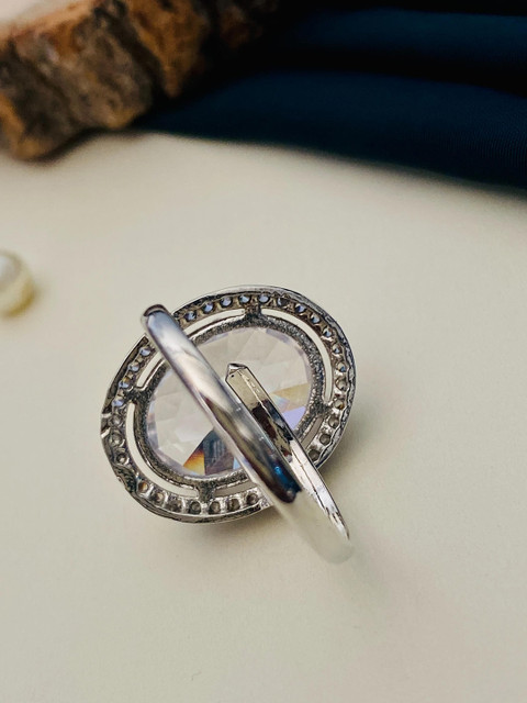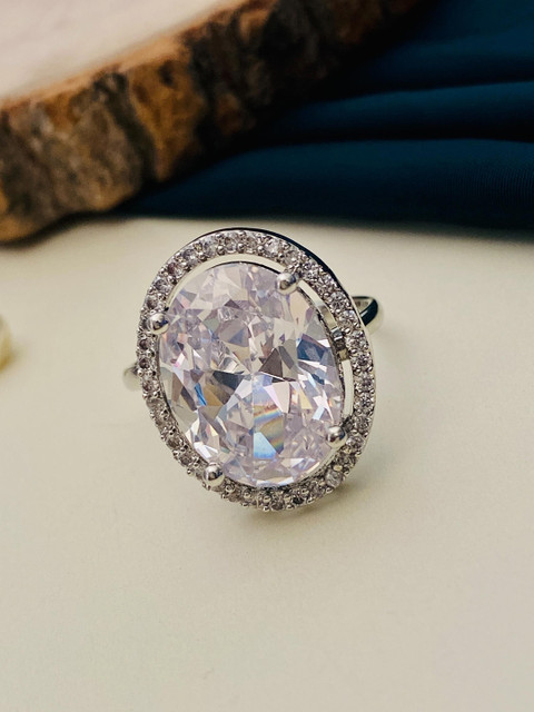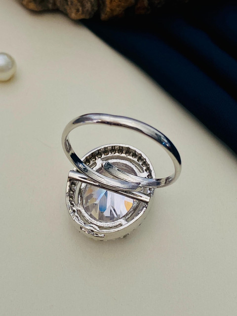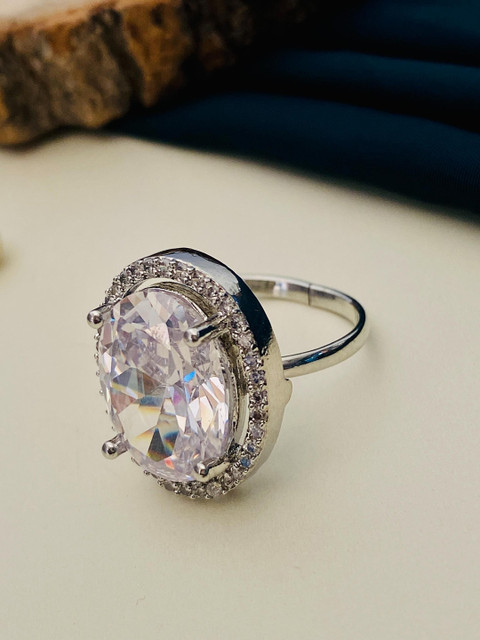 Silver-plated adjustable finger ring, has white american diamond stone-studded details