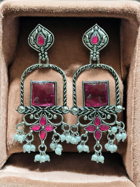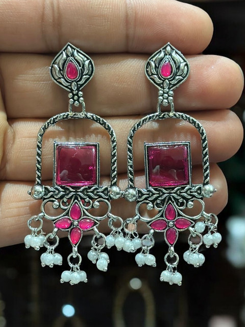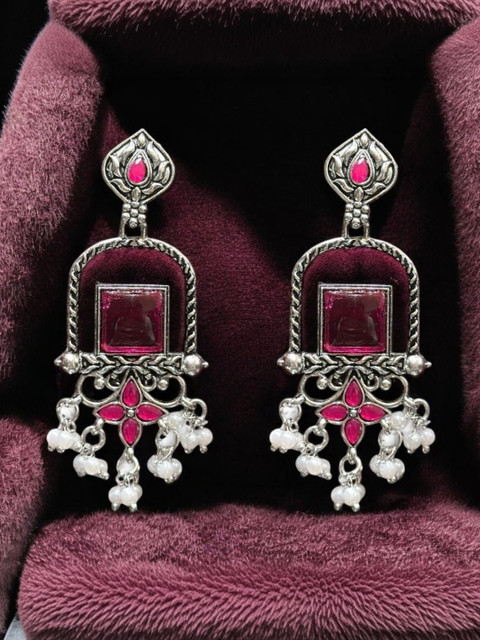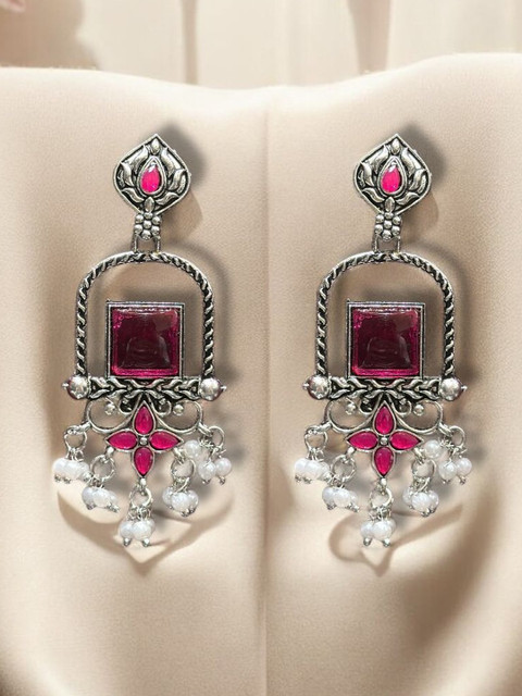Silver-toned geometric drop earrings, silver-plated, has artificial beads