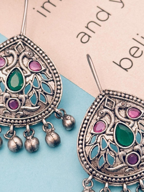 Silver-toned, pink and blue teardrop shaped drop earrings, has artficial stones studded and ghungroo beaded details