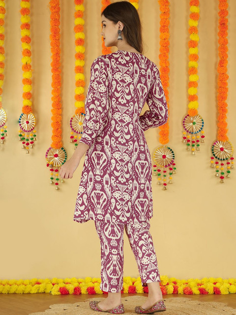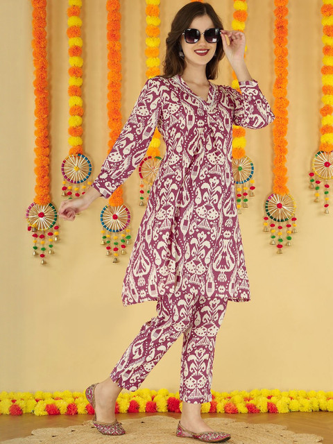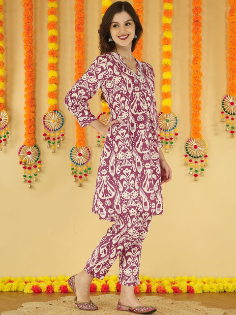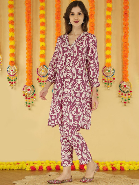 Anouk Women Ethnic Motifs Screen Print V-Neck Cotton Tunic With Trousers Co-Ords