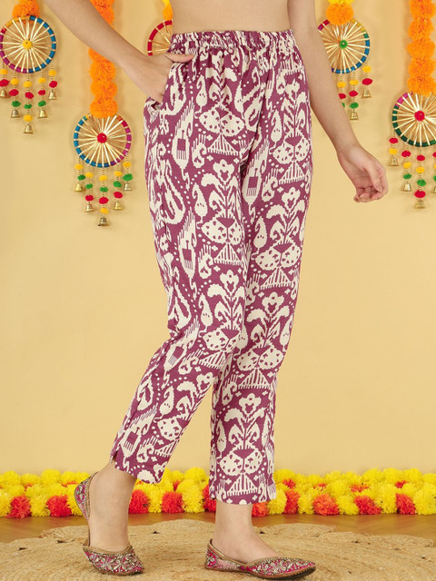 Maroon and beige printed trousers, has an elasticated waistband with slip-on closure and 1 pocket