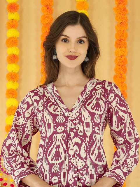 Maroon and beige printed tunic, has a v neck and three-quarter sleeves, has mirror work details
