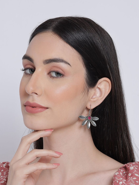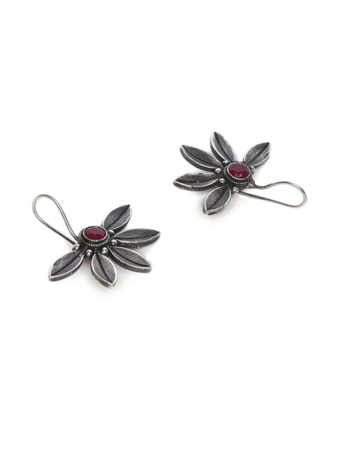 Women Red Oxidized Artificial Stones Floral Silver-Plated Ethnic Drop Earrings