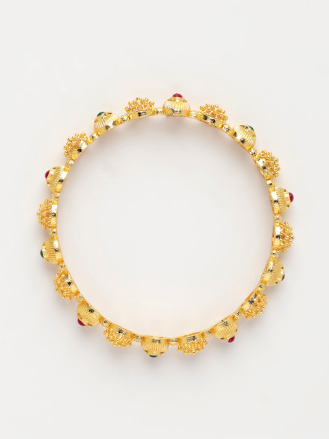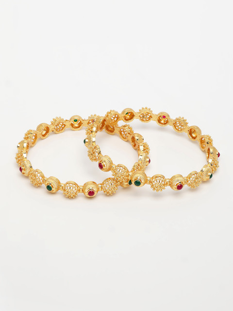 Set Of 2 gold-plated bangles, each has green and red stone-studded details, secured with slip-on closure