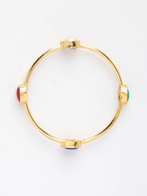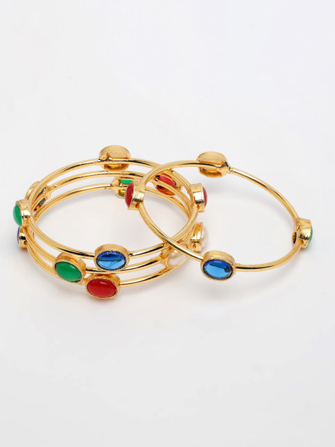 Set of 4 gold-plated bangles, each has blue, green and multi colored artificial stone studded details, secured with slip on closure