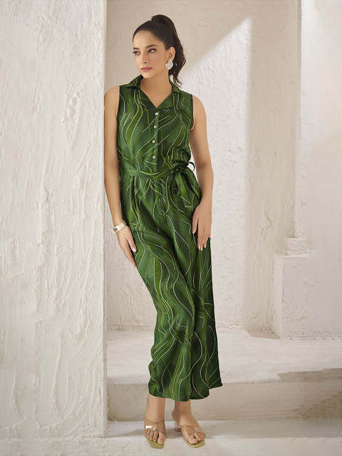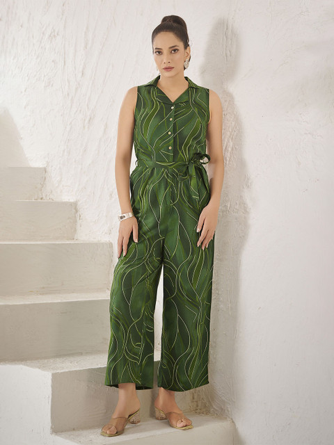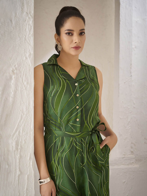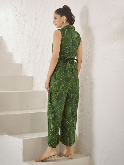 Green and white printed basic jumpsuit ,has a shawl neck, sleeveless, 2 pockets