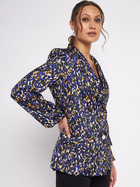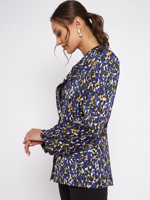 Blue and green printed regular-fit formal blazer, has a notched lapel, single-breasted with a double-button closure, long sleeves, two flap pockets and an attached lining