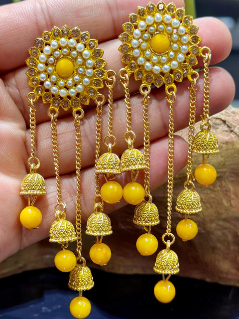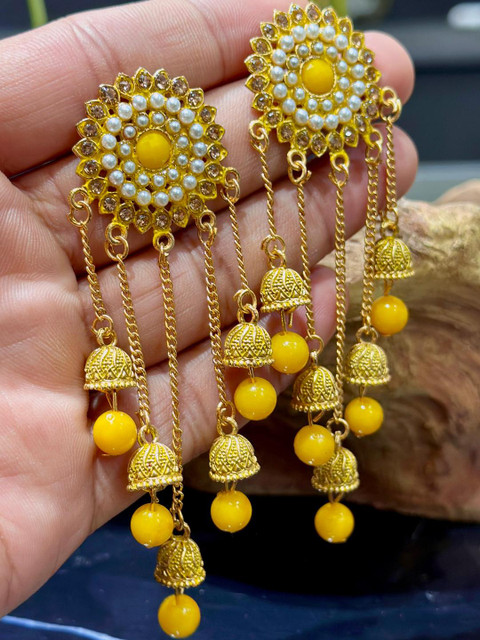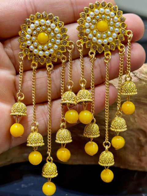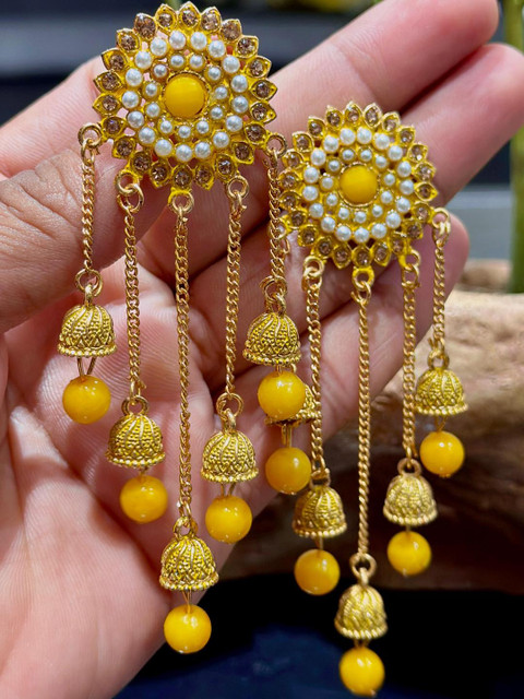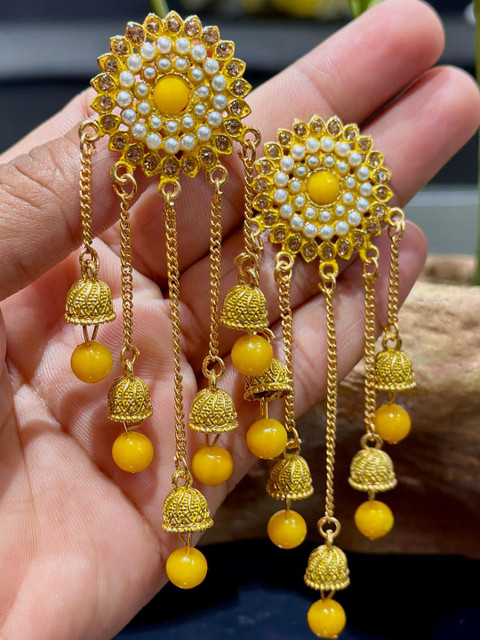 Yellow circular jhumkas, gold-plated, has artificial beads