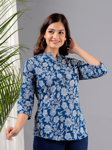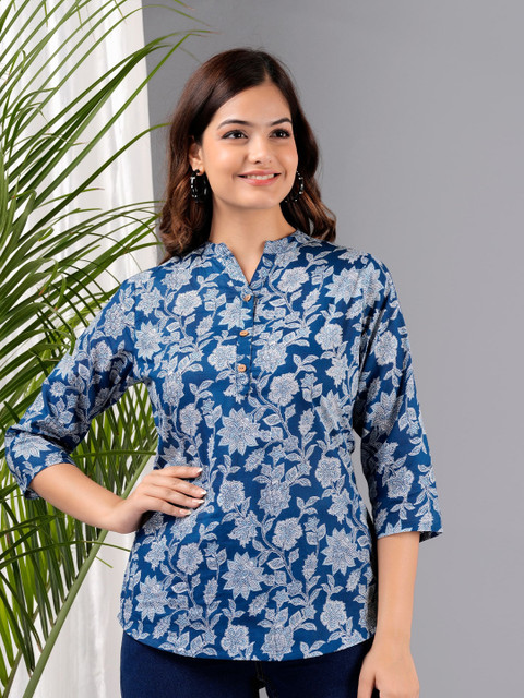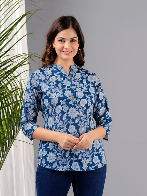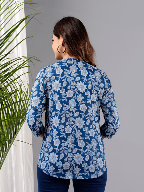 Navy Blue and white floral printed top,has a mandarin collar, three-quarter sleeves