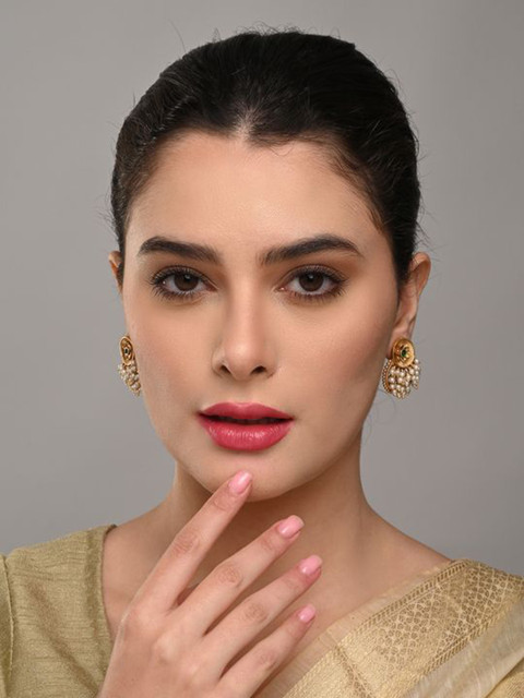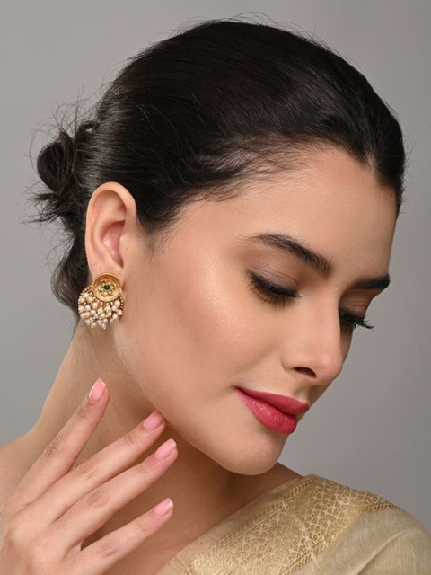 Gold-toned, white and green contemporary shaped drop earrings, has artificial beaded detail