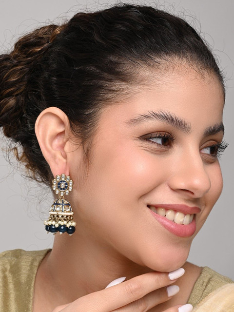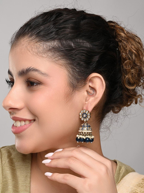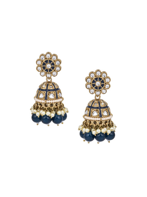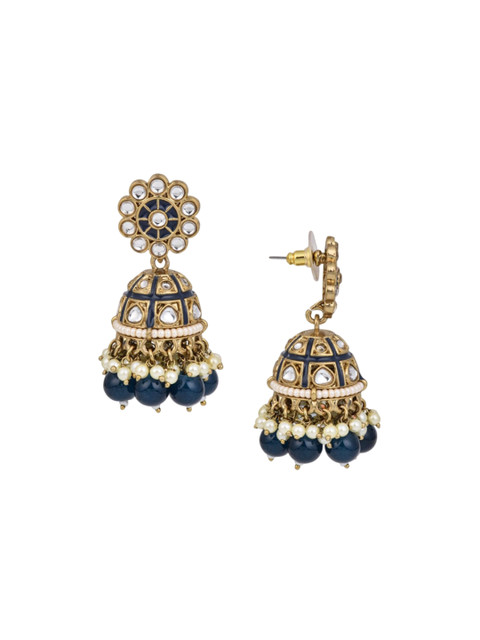 Navy blue contemporary jhumkas, gold-plated, has artificial stones and beads