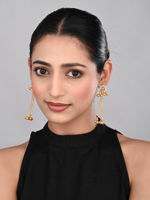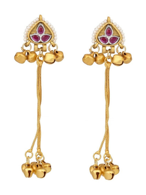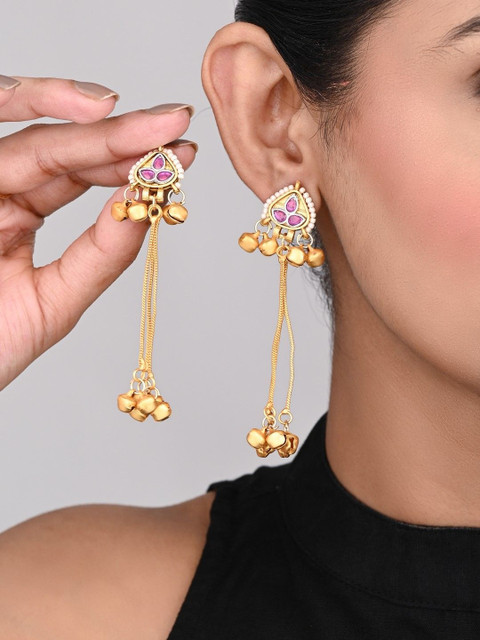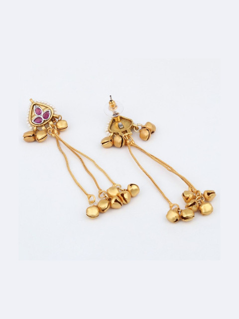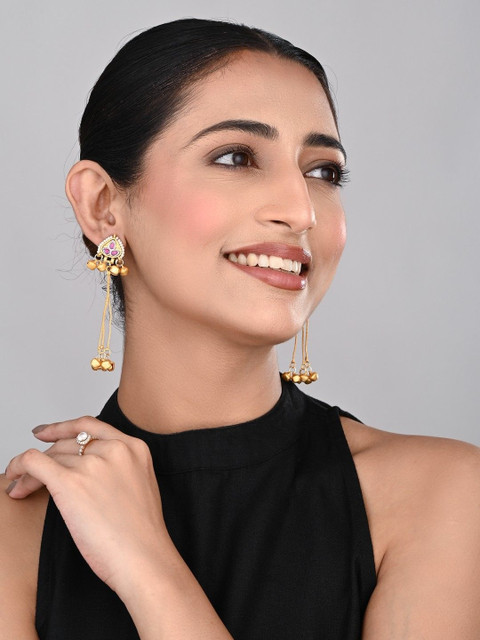 Gold-toned and red geometric drop earrings, has artificial stones studded and beaded details