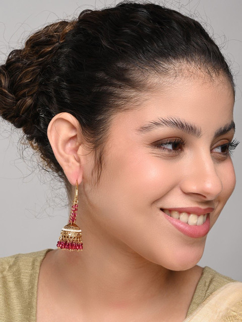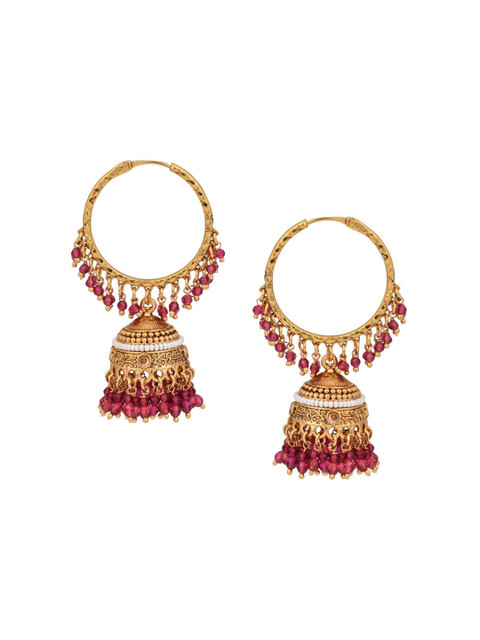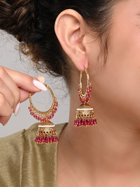 Gold-plated and red dome shaped jhumaks, gold-plated has artificial stone studded beaded details