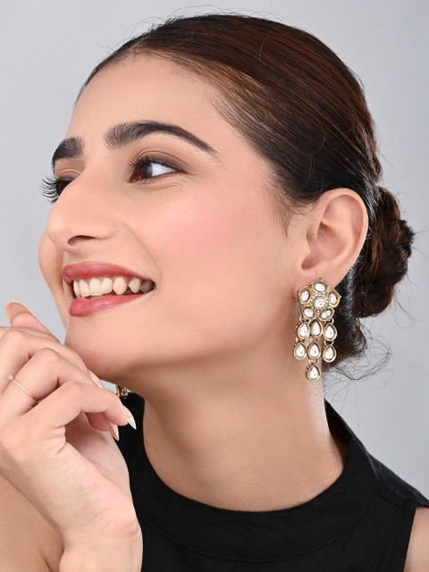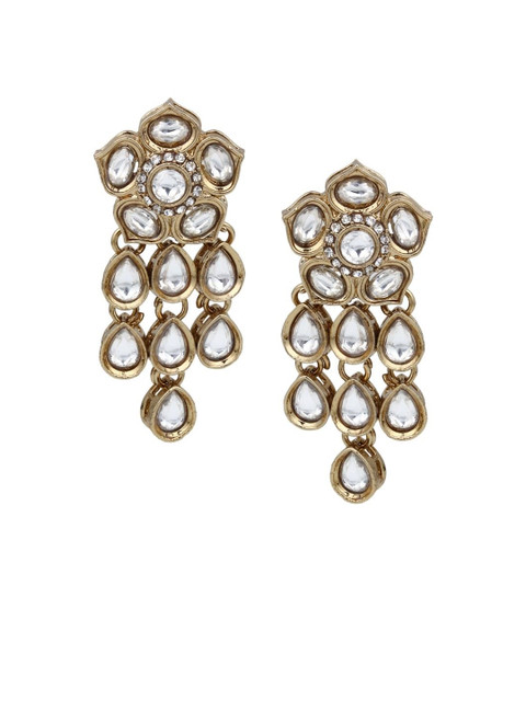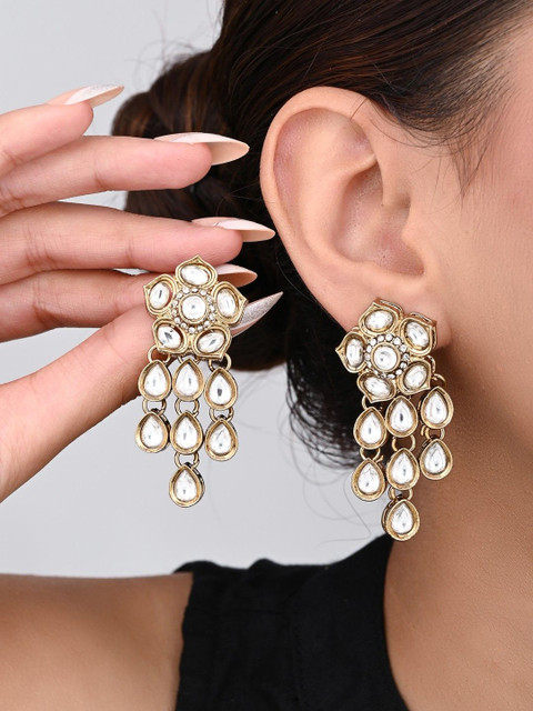 Gold-toned and white drop earrings, has kundan studded details
