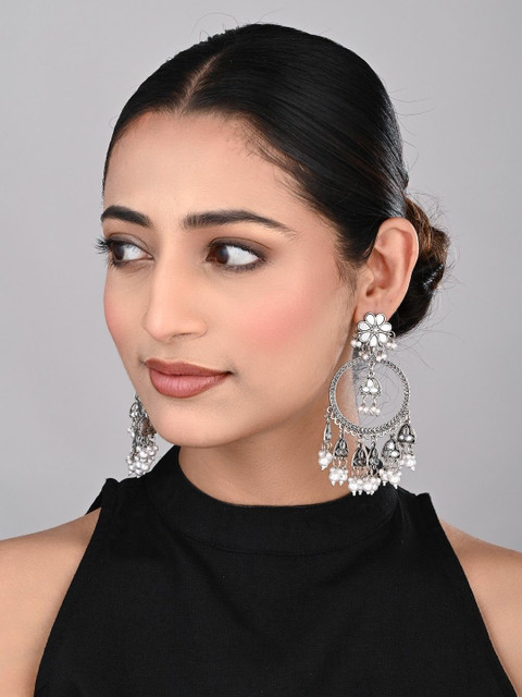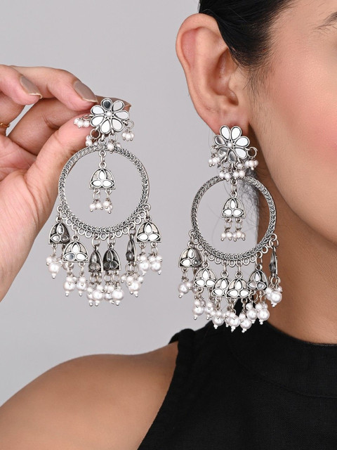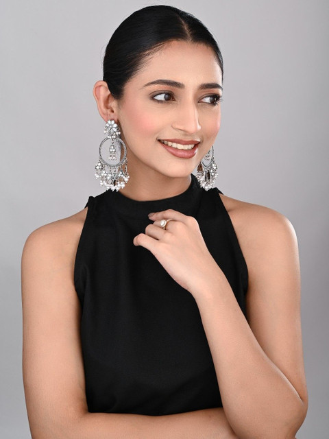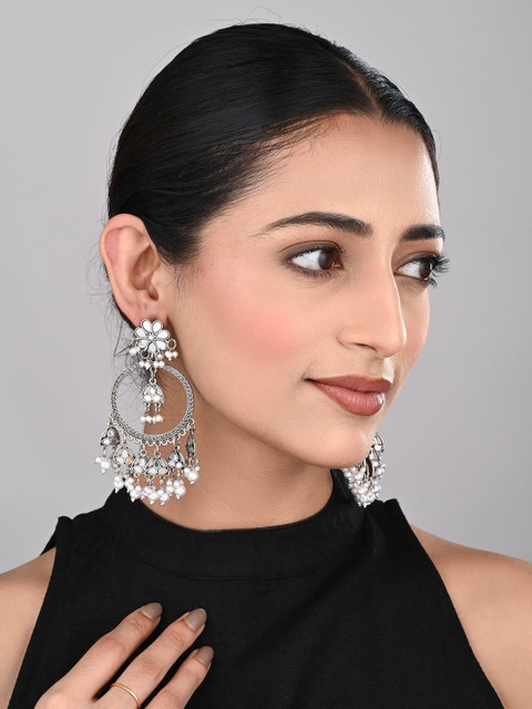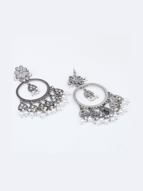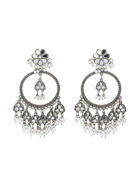 Silver-toned and white circular shaped drop earrings, has artificial stones studded and beaded details