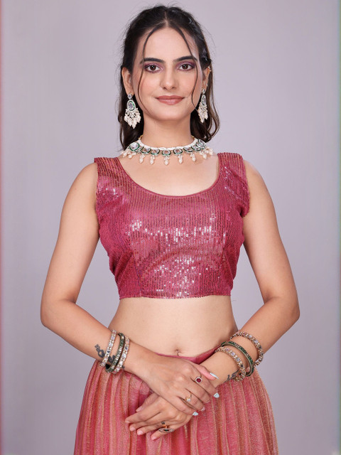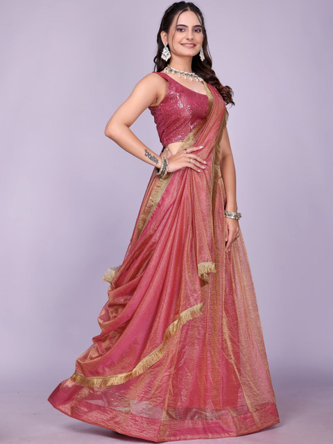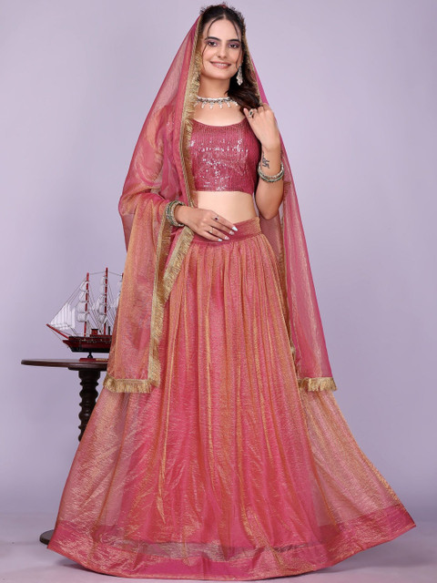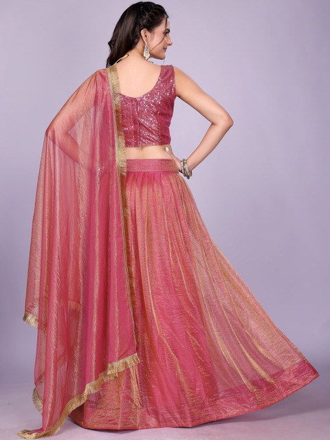 Pink and gold-toned embellished lehenga choli with dupatta, sequinned