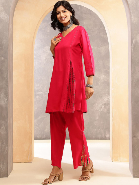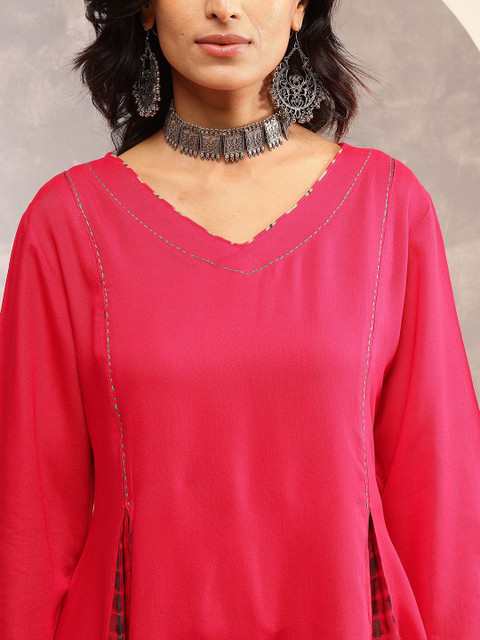 Pink solid tunic , has a vneck and Three-Quarter Sleeves