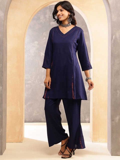 Blue solid tunic , has a vneck and Three-Quarter Sleeves
