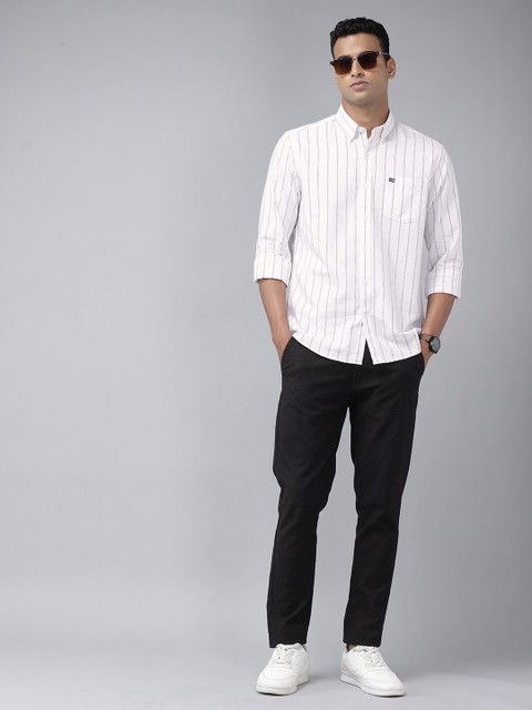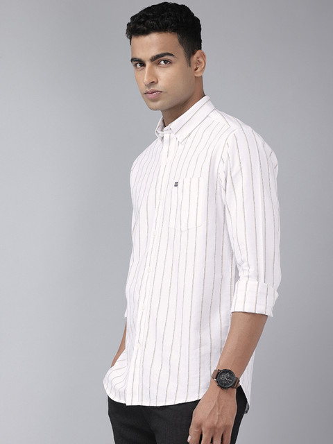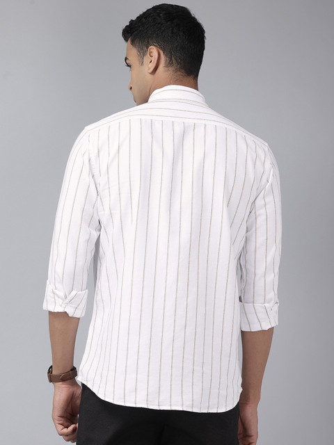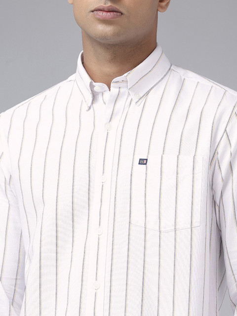 White striped opaque casual shirt, has a spread collar, button placket, 1 patch pocket, long regular sleeves, curved hem