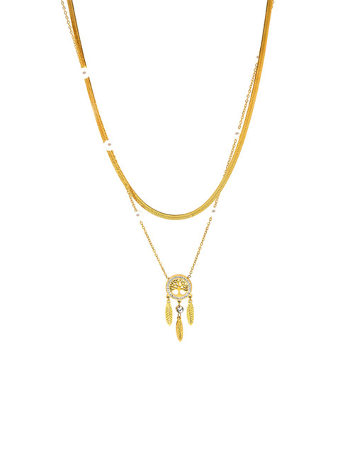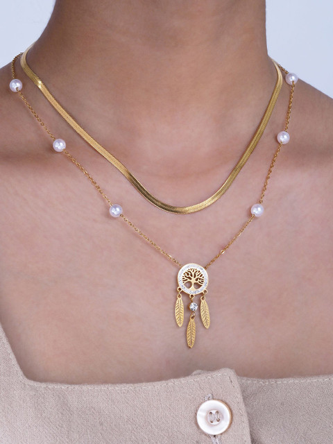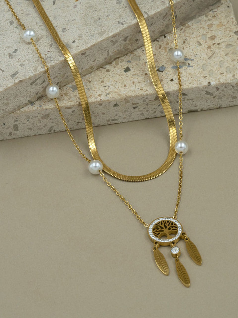 Gold-plated & white stone-studded with intricated details layered Necklace