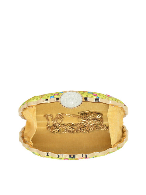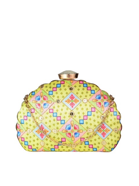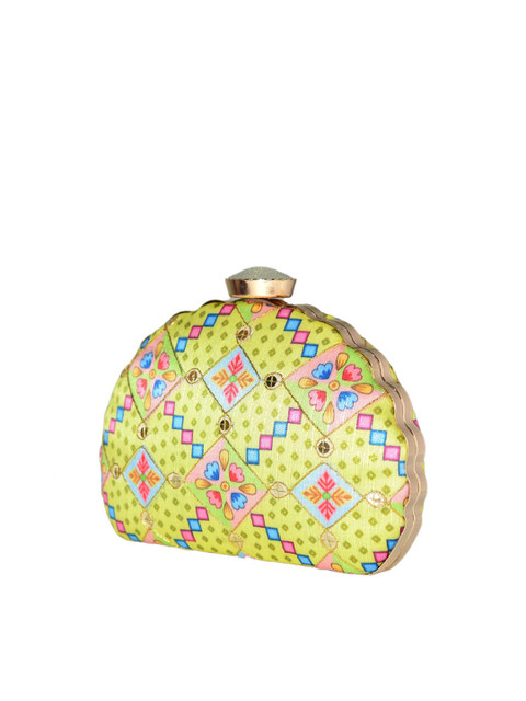 ARTKLIM Yellow & Pink Printed Embroidered Half Moon Clutch