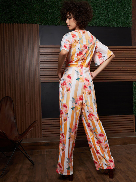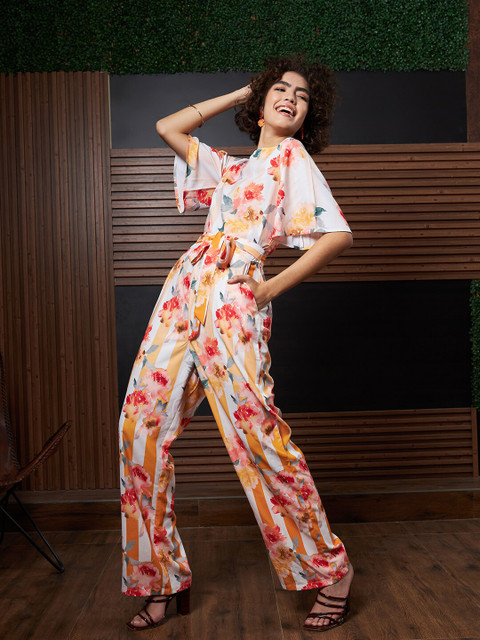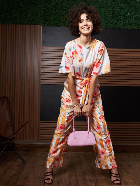 Athena Orange & White Floral Printed Basic Jumpsuit With Waist Tie-Ups