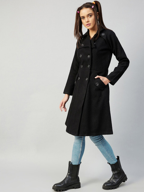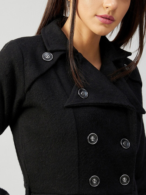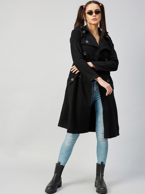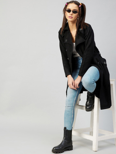 Black solid trench coat with notched lapel collar, double breasted, button closures, two pockets on the front, belt loops and belt and an attached lining