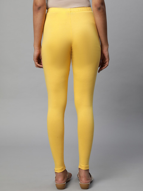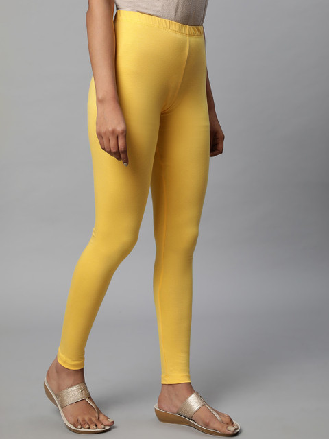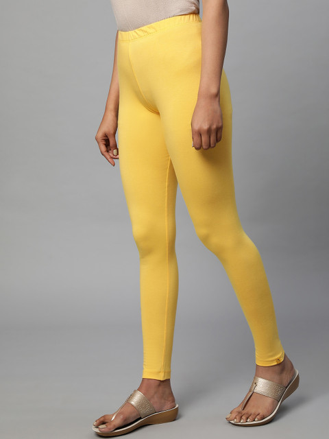 Yellow solid ankle length leggings, has an elasticated waistband and slip-on closure