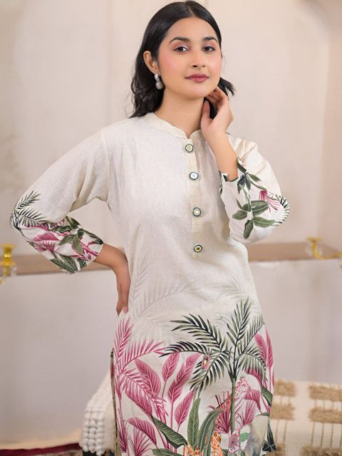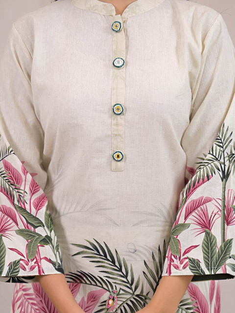 Off white, green and pink embroidered kurta, has mandarin neck, three-fourth sleeves.