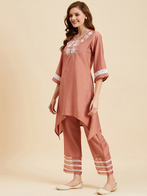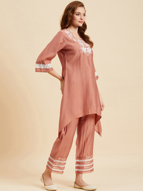 Peach-coloured floral embroidered tunic, has v-neck, three-quarter sleeves