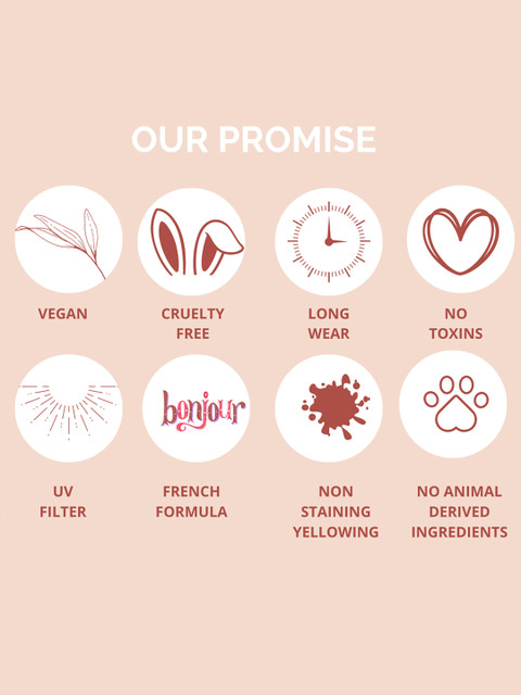 No toxins Vegan Cruelty freeFrench FormulaUV filterLong stay Non yellowing No animal derived ingredients