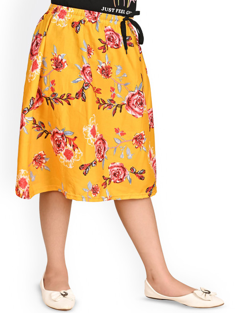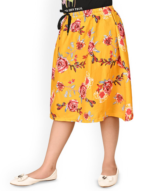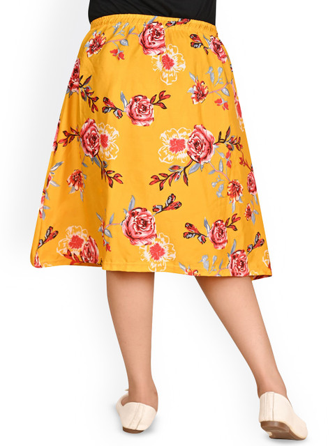Yellow floral printed flared knee-length skirt, has an elasticated waistband with drawstring clouser